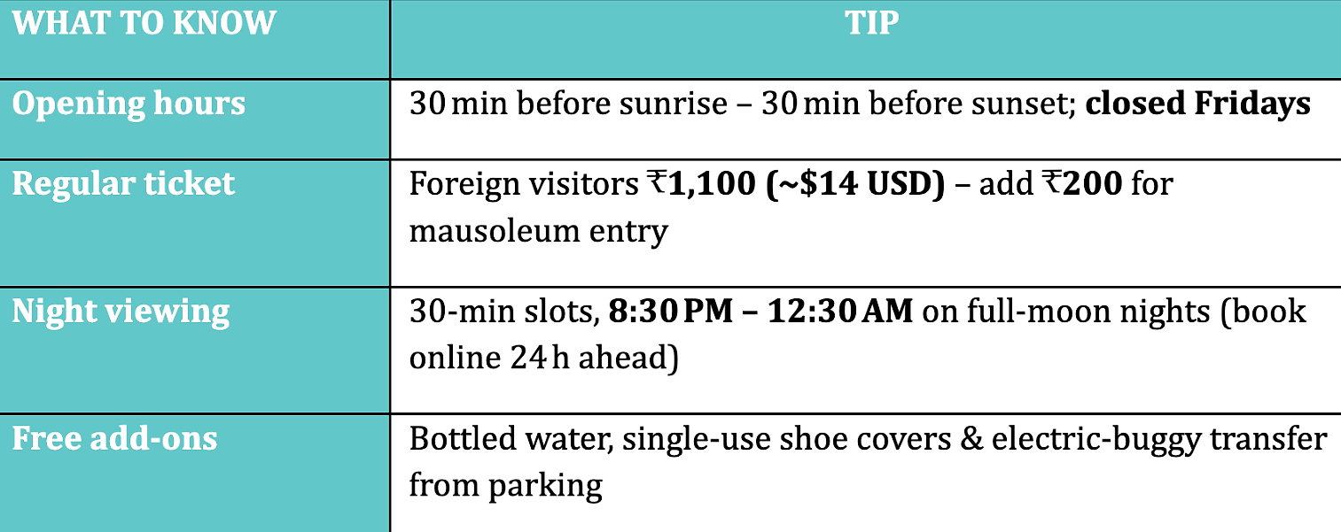 Before diving into ticket hacks and photo angles, skim this quick-reference cheat sheet for the latest Taj Mahal essentials, including opening times, costs, night-viewing slots and freebies – so you can plan like a pro in seconds.