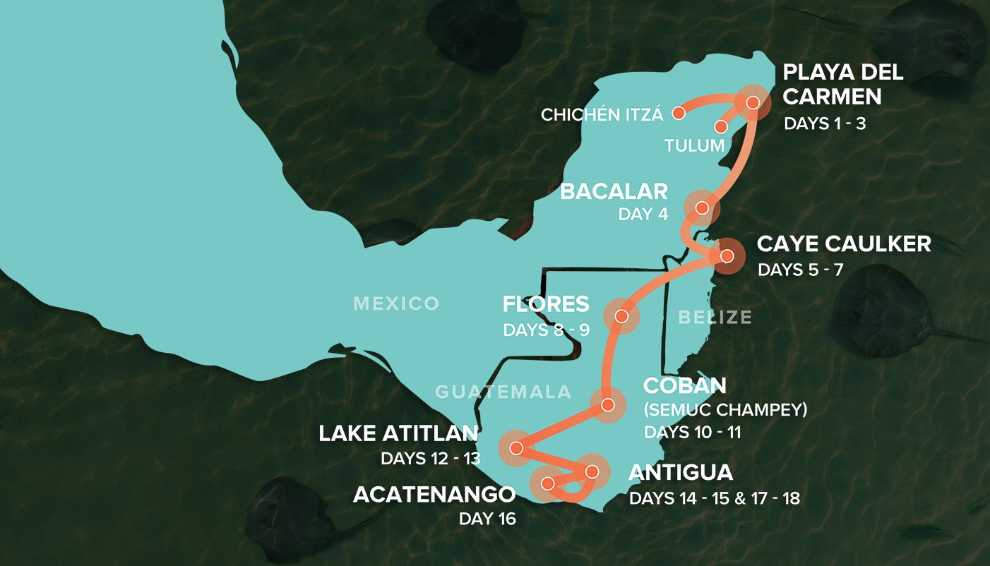 Explore fiery volcanic peaks, dive into the vibrant marine life of the world’s second-largest barrier reef, and uncover the ancient secrets of Mayan civilisations. This 18 day journey through Mexico, Belize, and Guatemala will be an experience you’ll remember forever! Dive into mesmerising underwater realms, gaze in awe before ancient pyramids that rise from lush jungles, and conquer the heights of a volcano, with some authentic, off-the-beaten-track experiences along the way. You won’t be alone – an awesome group leader and a band of adventurous new friends will be right by your side. The trip of a lifetime is calling your name, and the jungle is bursting with adventure.