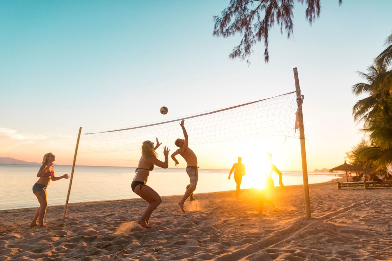 Beach volleyball at sunset